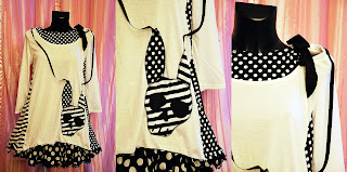 Robe tunique blanche et noire avec poche fausse pochette lapin et noeud épaule gauche, empiècements tissus différents noirs et blancs : 86 € sold out